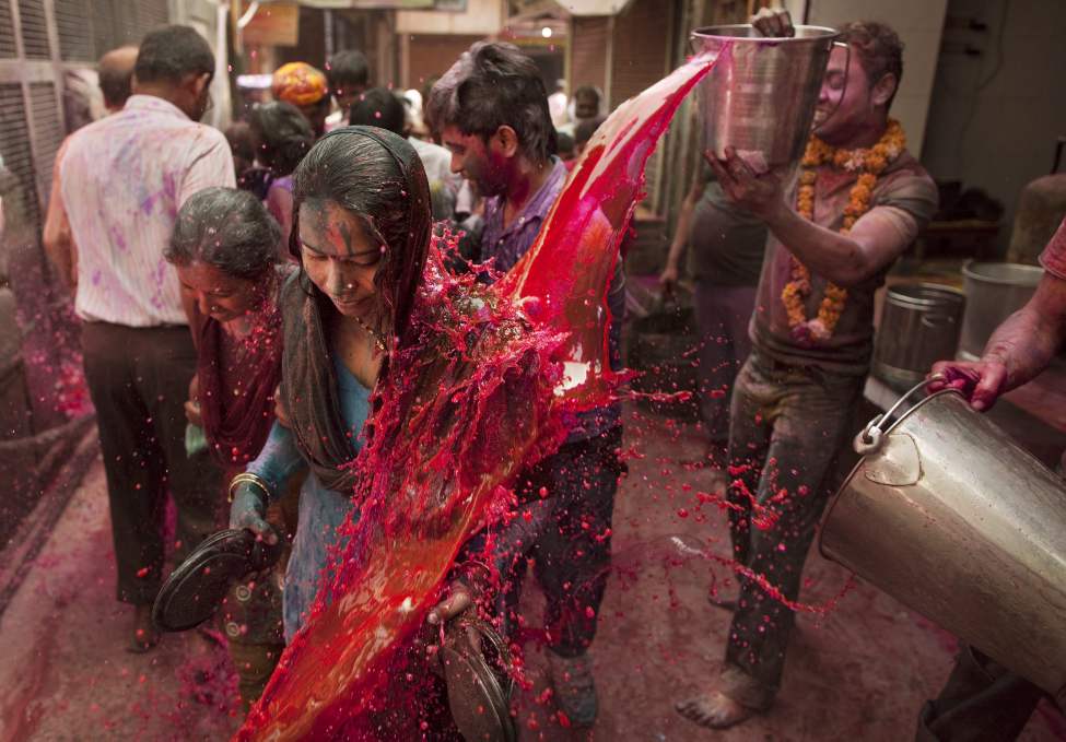A Hindu devotee has a bucket of coloured water poured on her whilst walking to the the Banke Bihari temple to celebrate "Holi," the festival of colour, in Vrindavan, about 140 kilometers, 87 miles, from New Delhi, India, Thursday, March 8, 2012. Vrindavan is a famous place for Holi celebrations, where according to legend, the Hindu god Krishna played Holi with his consort Radha. (AP Photo/Kevin Frayer)CP