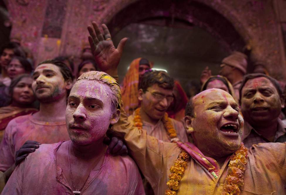 Hindu devotees are covered in colored powder as they arrive to celebrate "Holi," the festival of color, at the Banke Bihari temple in Vrindavan, about 140 kilometers (87 miles) from New Delhi, India, Thursday, March 8, 2012. Vrindavan is a famous place for Holi celebrations, where according to legend, the Hindu god Krishna played Holi with his consort Radha. (AP Photo/Kevin Frayer)CP