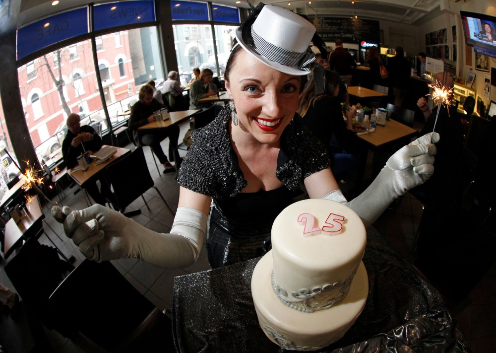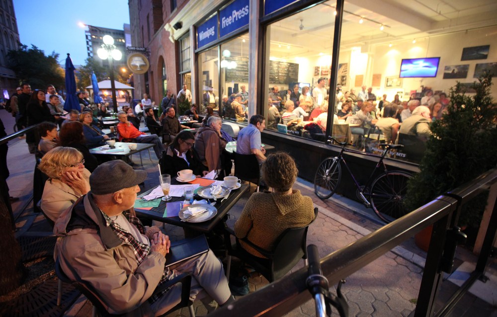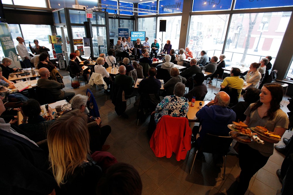 In this file photo, overflow participants watch a political debate from the patio at the Winnipeg Free Press News Cafe.Winnipeg Free Press