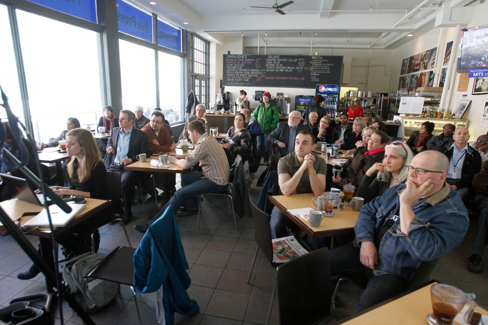 Winnipeg Free Press News CaféJason Kenney, Minister of Citizenship, Immigration and Multiculturalism discusses recent changes to the immigration system at the Free Press News Caf� Monday. Dan Lett reporting. (WAYNE GLOWACKI/WINNIPEG FREE PRESS) Winnipeg Free Press April 16 2012Canadian soccer Olympian and bronze medalist Desiree Scott visits Free Press News Caf� Friday. Geoff Kirbyson story.(WAYNE GLOWACKI/WINNIPEG FREE PRESS) Winnipeg Free Press Aug. 17 2012Actors in the movie The Divide from left Abbey Thickson, Michael Biehn and Jennifer Blanc interviewed by reporter Randall King at the Winnipeg Free Press News Cafe Thursday. (WAYNE GLOWACKI/WINNIPEG FREE PRESS) Winnipeg Free Press Jan. 19 2012Crowd on hand as Jason Kenney, Minister of Citizenship, Immigration and Multiculturalism discusses recent changes to the immigration system at the Free Press News Caf� Monday. Dan Lett reporting. (WAYNE GLOWACKI/WINNIPEG FREE PRESS) Winnipeg Free Press April 16 2012Mike Moore, President of the Manitoba Home Builders Association, Mark Chipman of True North Sports and Entertainment, and Arni Thorsteinson, at the launch for Back in the Bigs, at the News Cafe, October 5th, 2011. (TREVOR HAGAN/WINNIPEG FREE PRESS)Melissa Tait / Winnipeg Free Press archives