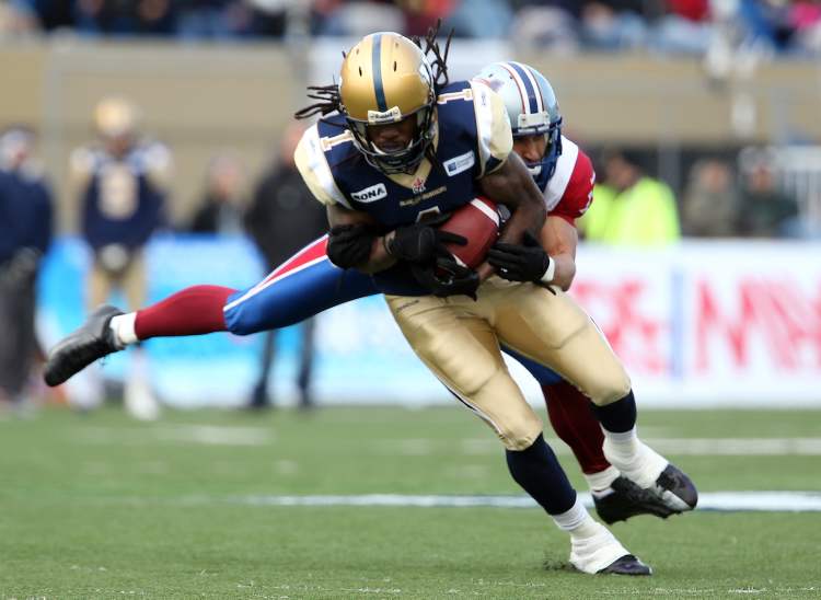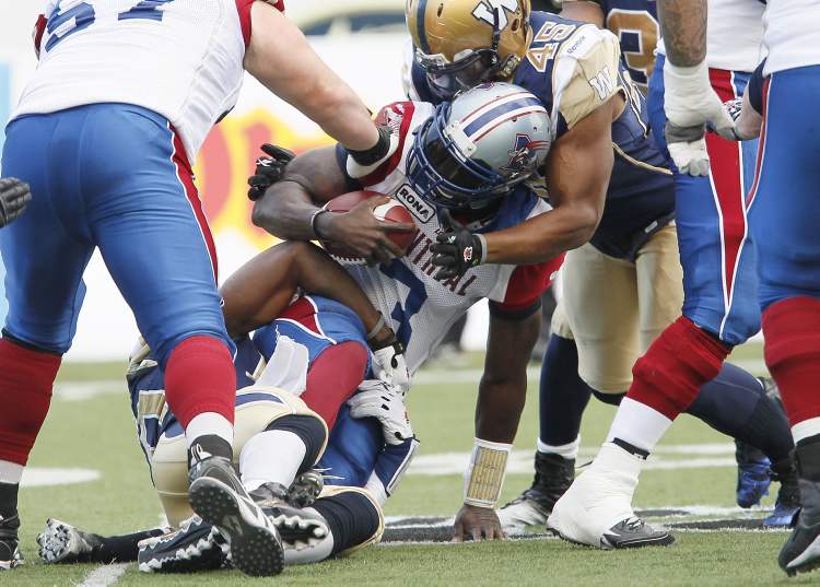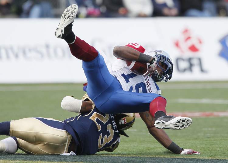 Winnipeg Blue Bombers' Kito Pohlah (1) is wrapped up by Montreal Alouettes' Chip Cox (11) during the first half of CFL action in the final game at Canad Inns Stadium, Saturday