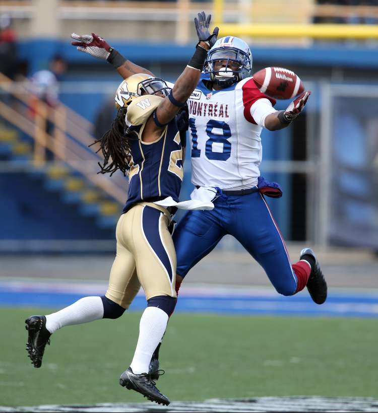 Winnipeg Blue Bombers' Alex Suber (21) puts a hand in the face of Montreal Alouettes' Jamel Richardson (18) during the first quarter of CFL action in the final game at Canad Inns Stadium, Saturday.