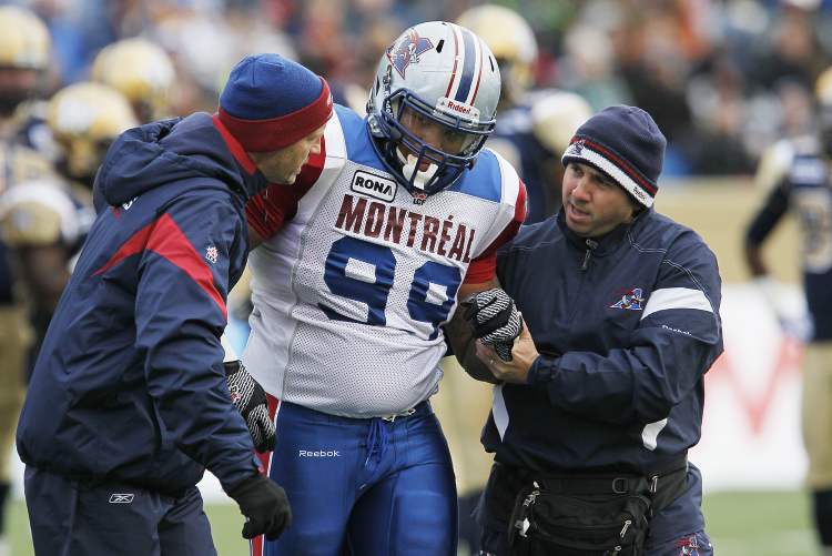 John Woods / The Canadian Press Montreal Alouettes' Scooter Berry (99) heads off the field with an injury during the first half of their CFL game against Winnipeg Blue Bombers in Winnipeg on Saturday.