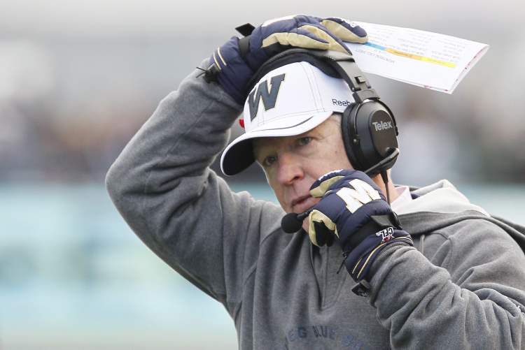 Winnipeg Blue Bombers' head coach Tim Burke adjusts his headset during the first half of their CFL game against Montreal Alouettes in Winnipeg on Saturday.