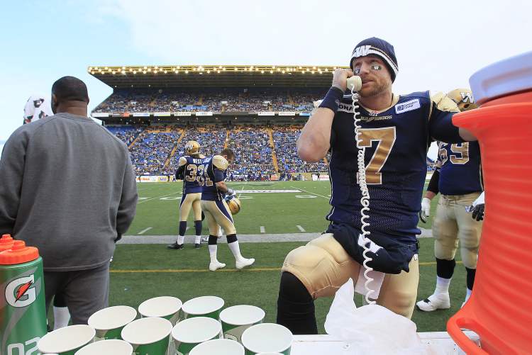John Woods / The Canadian Press Winnipeg Blue Bombers' quarterback Alex Brink (7) on the phone to coaches during the first half of their CFL game against the Montreal Alouettes in Winnipeg on Saturday.