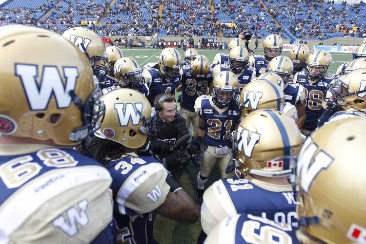 The Winnipeg Blue Bombers take a moment before facing the Montreal Alouettes at the Canad Inns Stadium Saturday.