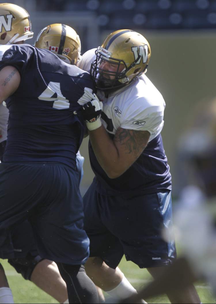 New Winnipeg Blue Bomber offensive linesman #56 Colt Schulte (right) at practice on Investors Group Field Thursday. Wayne Glowacki / Winnipeg Free Press
