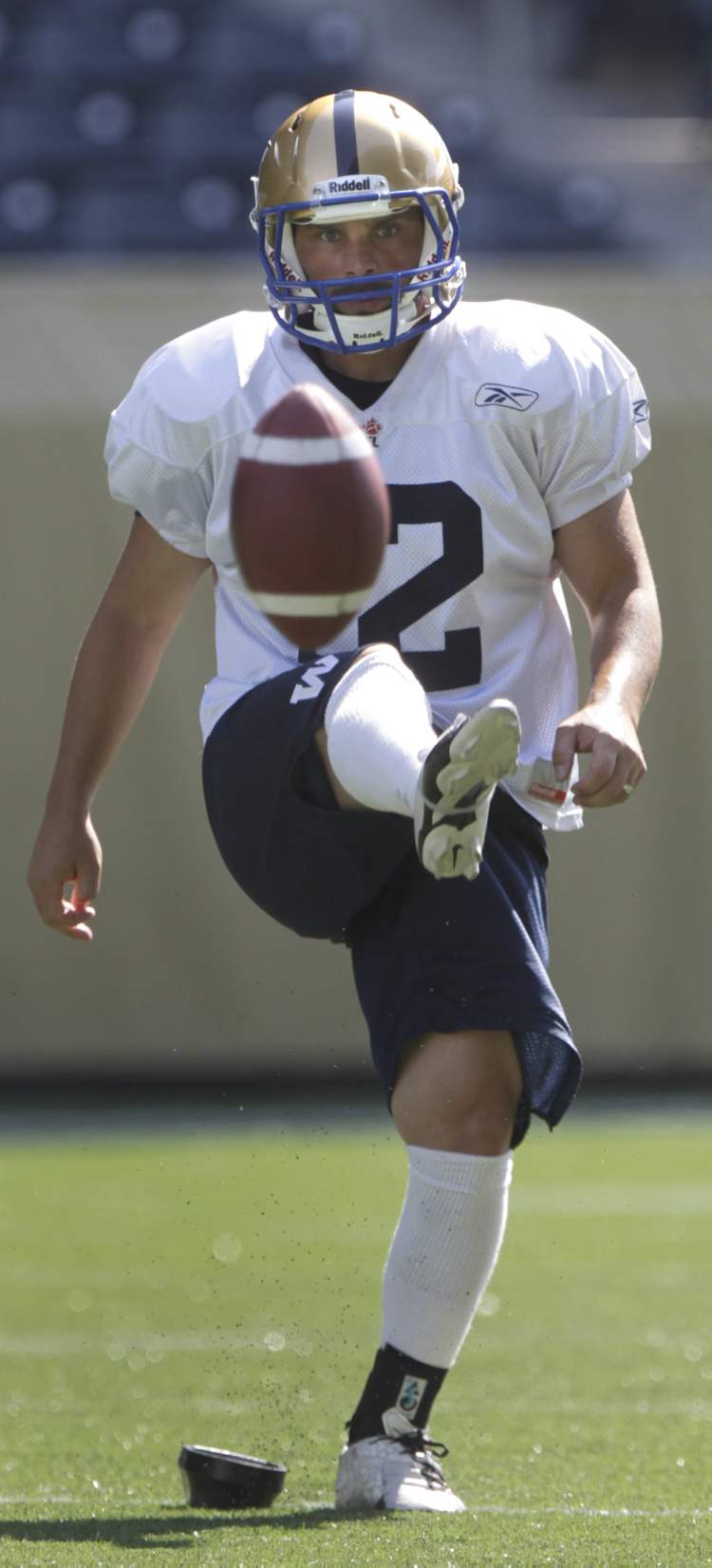 Winnipeg Blue Bomber kicker #12 Sandro DeAngelis at practice on Investors Group Field Thursday.