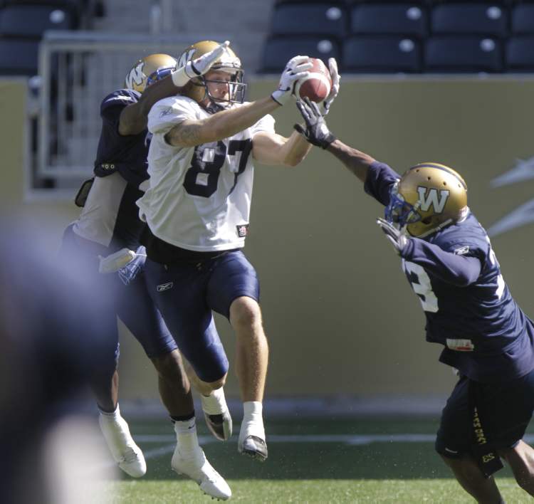 Winnipeg Blue Bomber slot back #87 Rory Kohlert catches a pass with close coverage at practice on Investors Group Field Thursday.