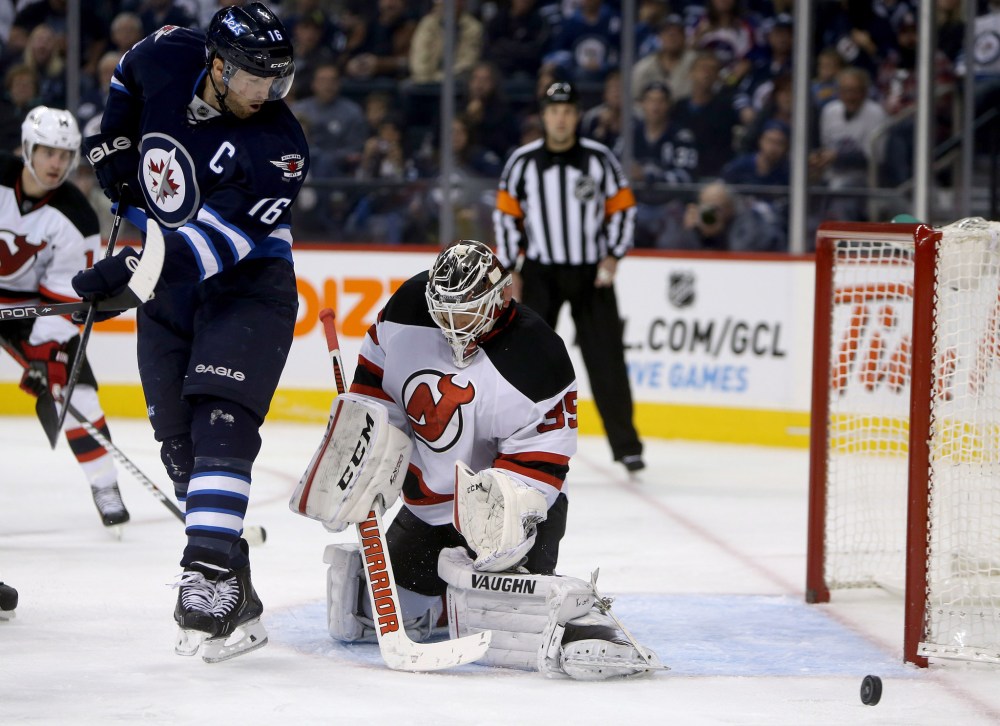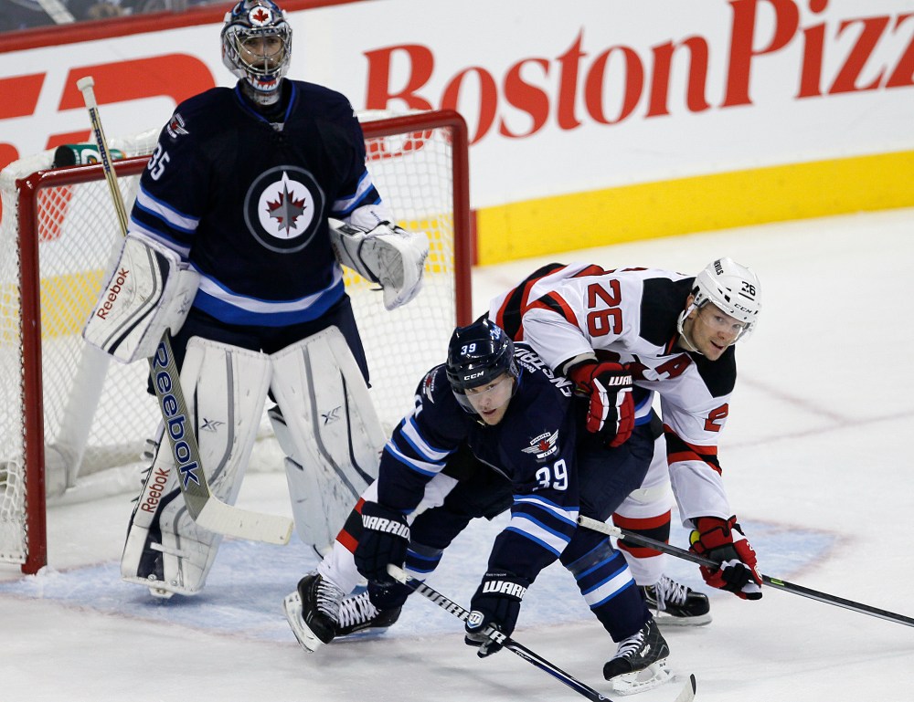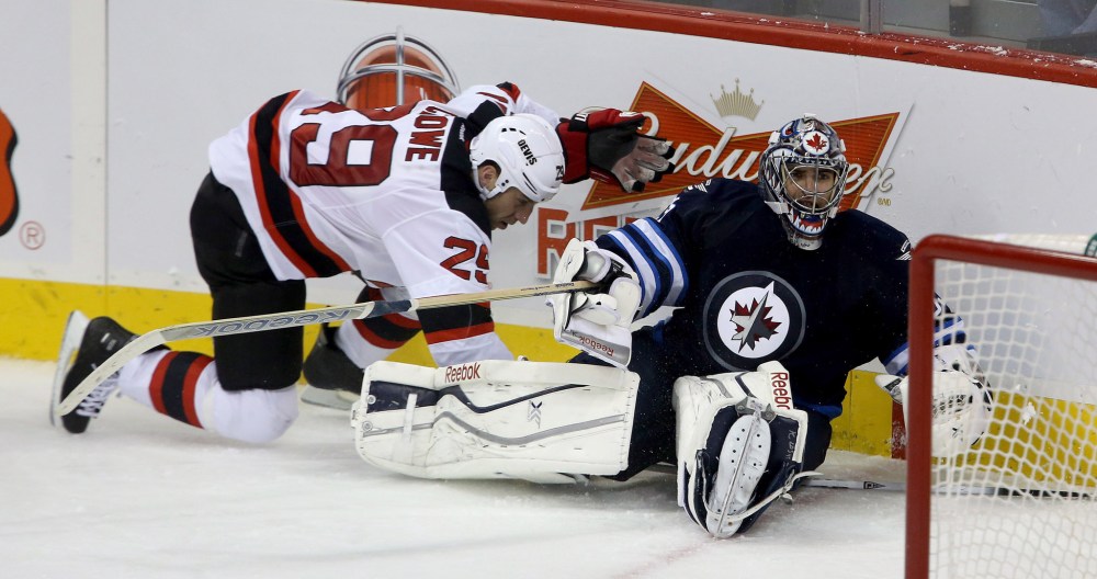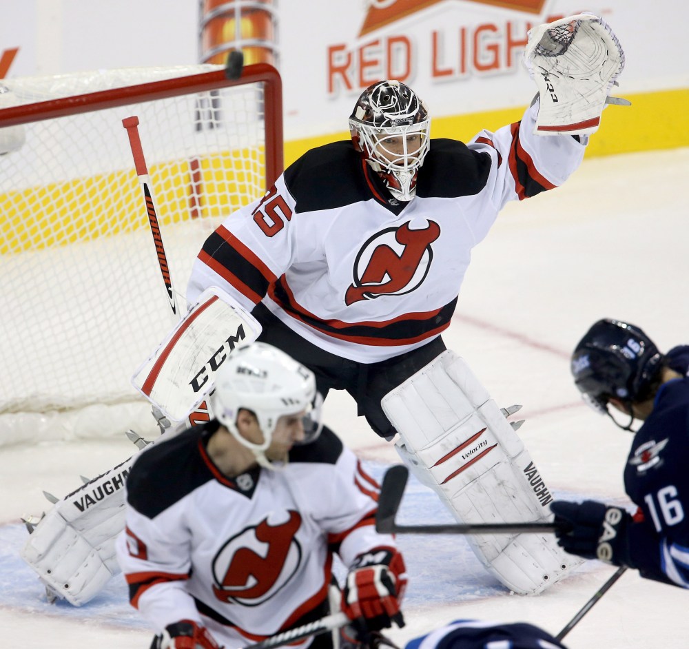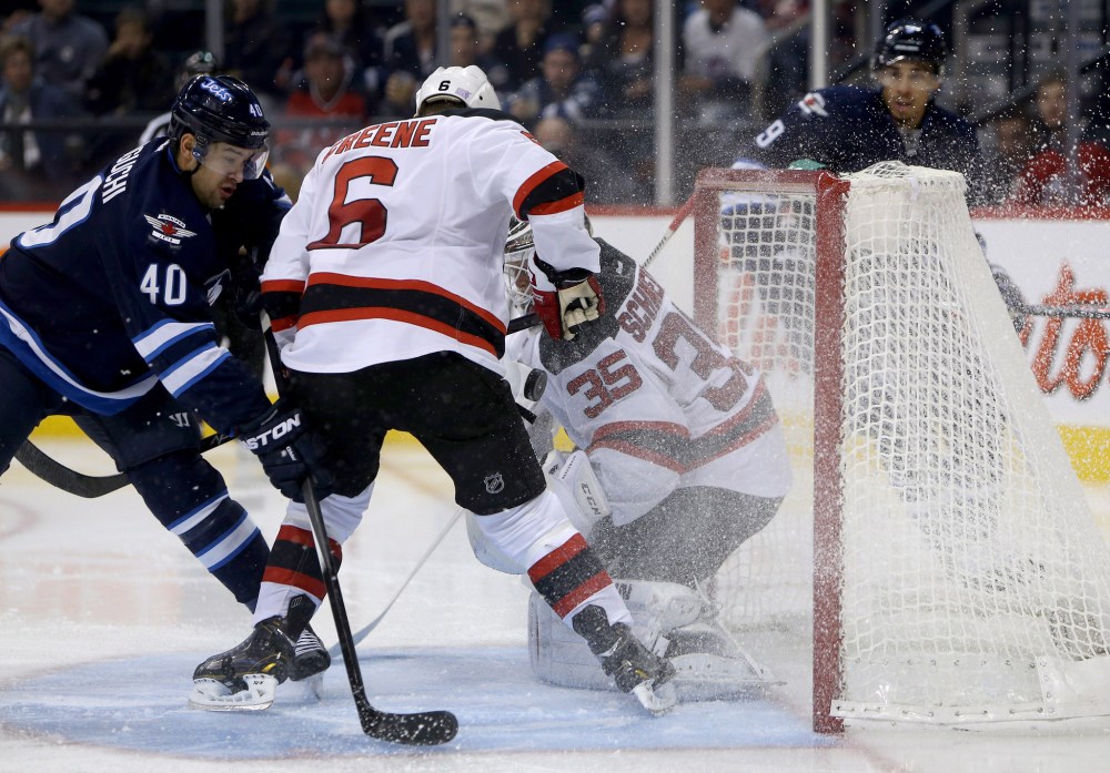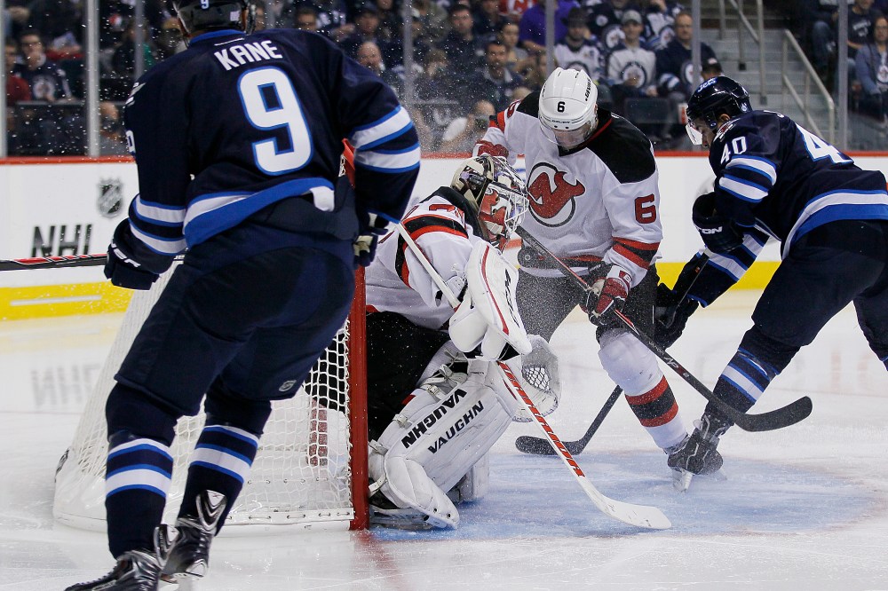 Evander Kane's shot deflects off New Jersey Devils' Andy Greene and past goaltender Cory Schneider for the Jets first goal during the second period.