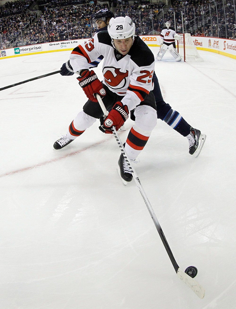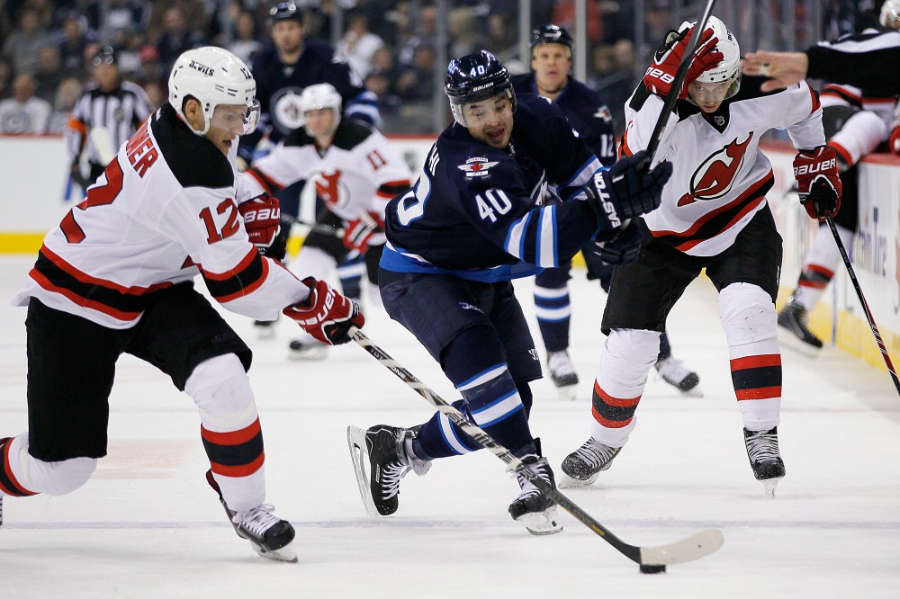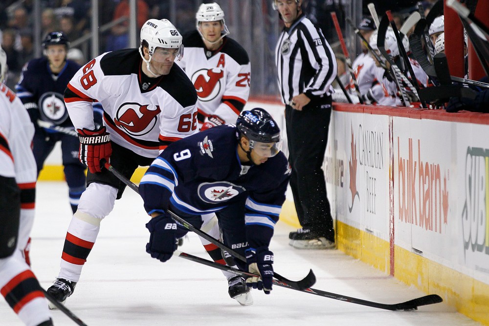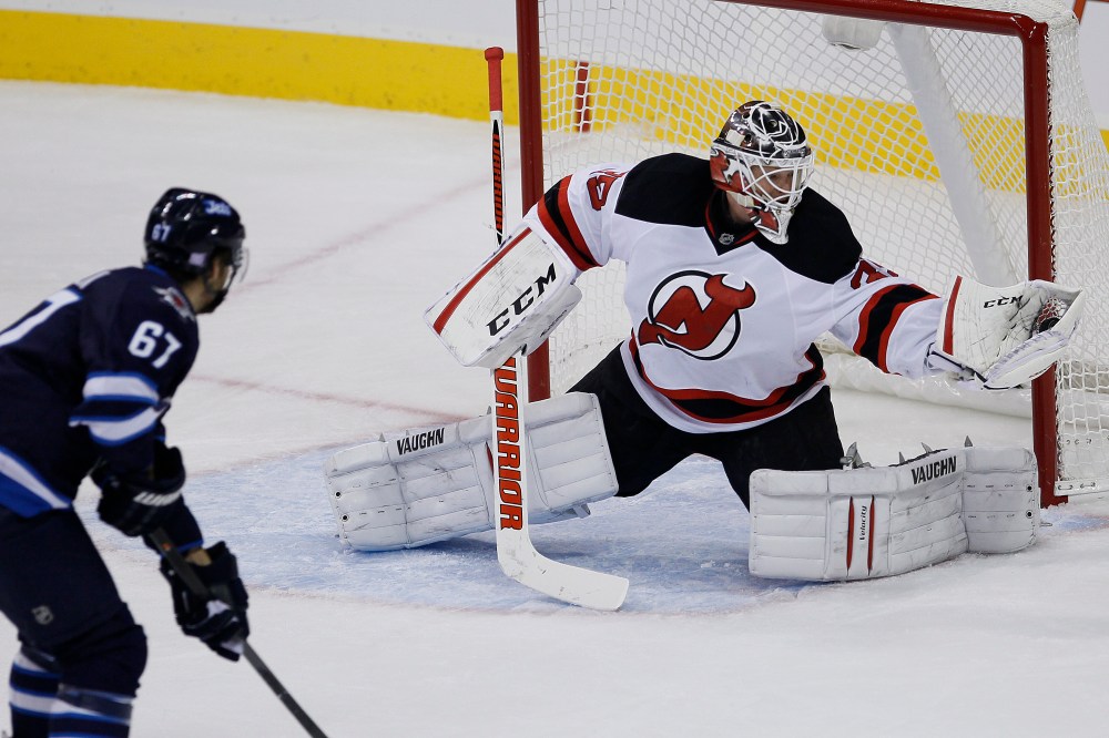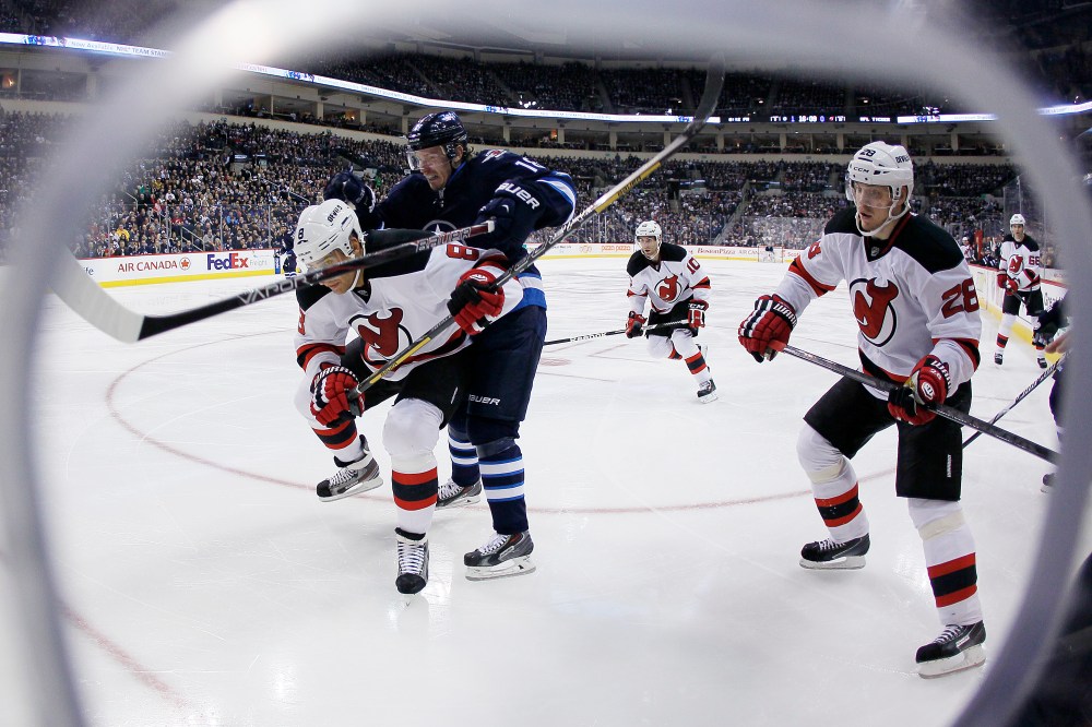 Evander Kane's shot deflects off New Jersey Devils' Andy Greene and past goaltender Cory Schneider for the Jets first goal during the second period.