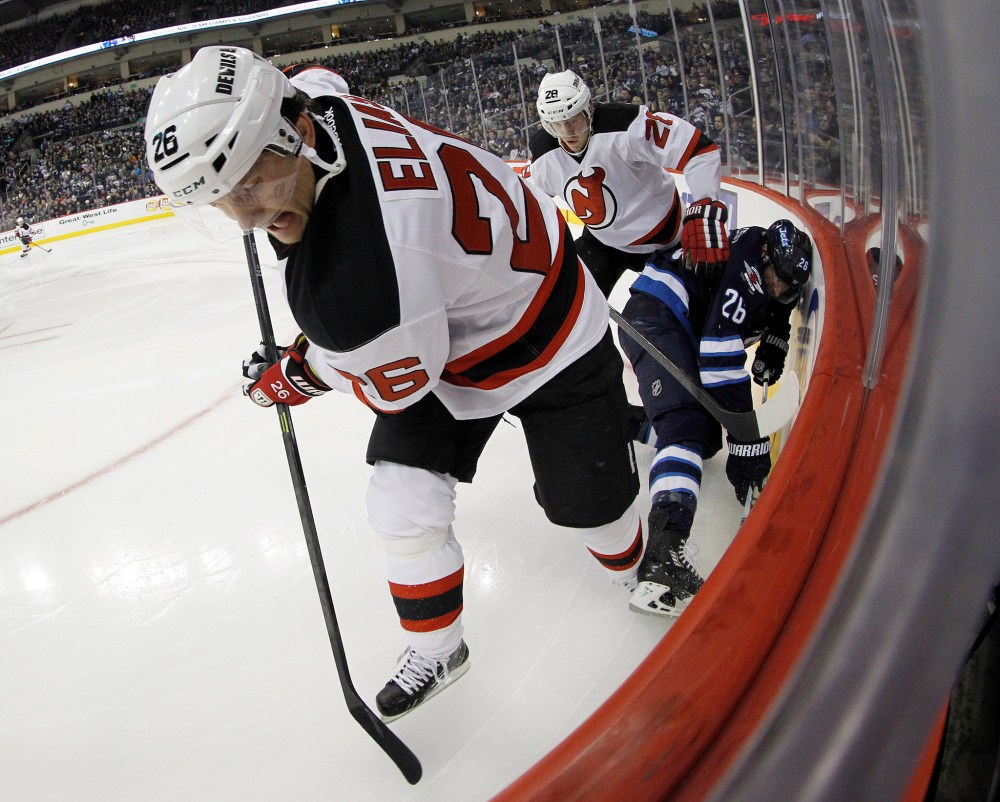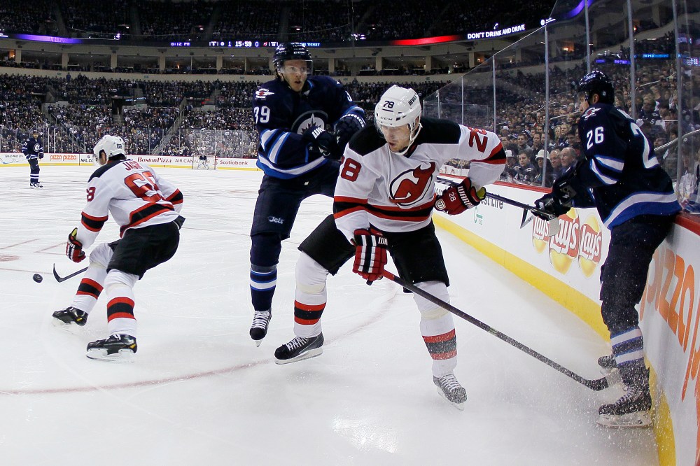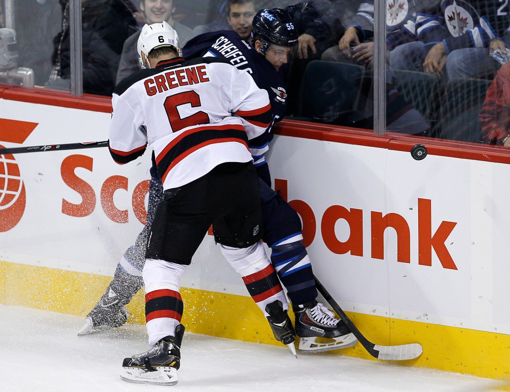 Mark Scheifele gets tied up by Andy Greene during the first period.