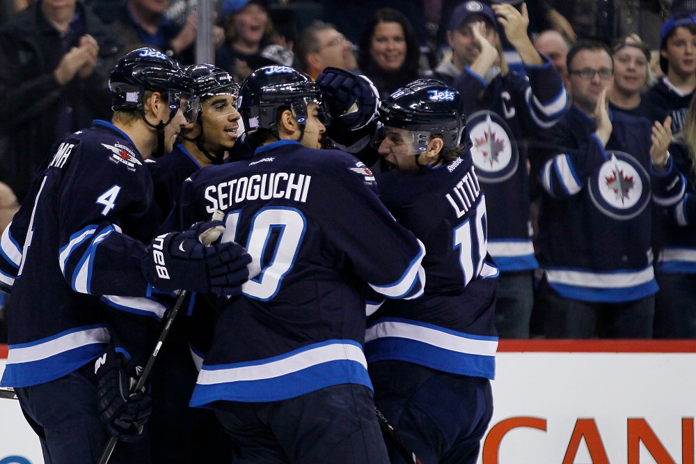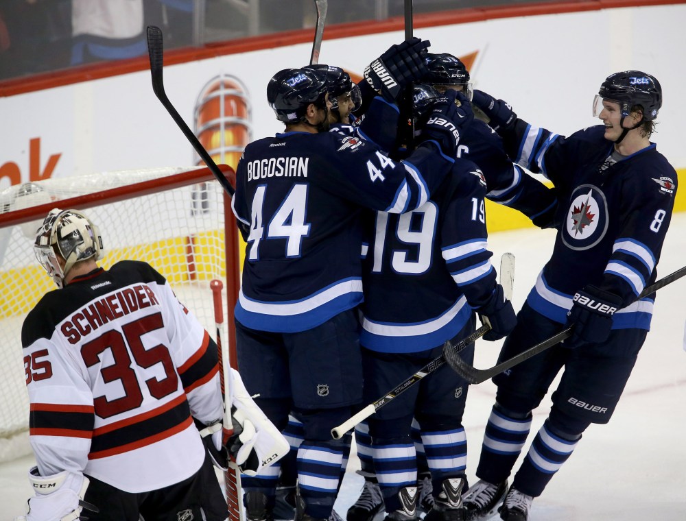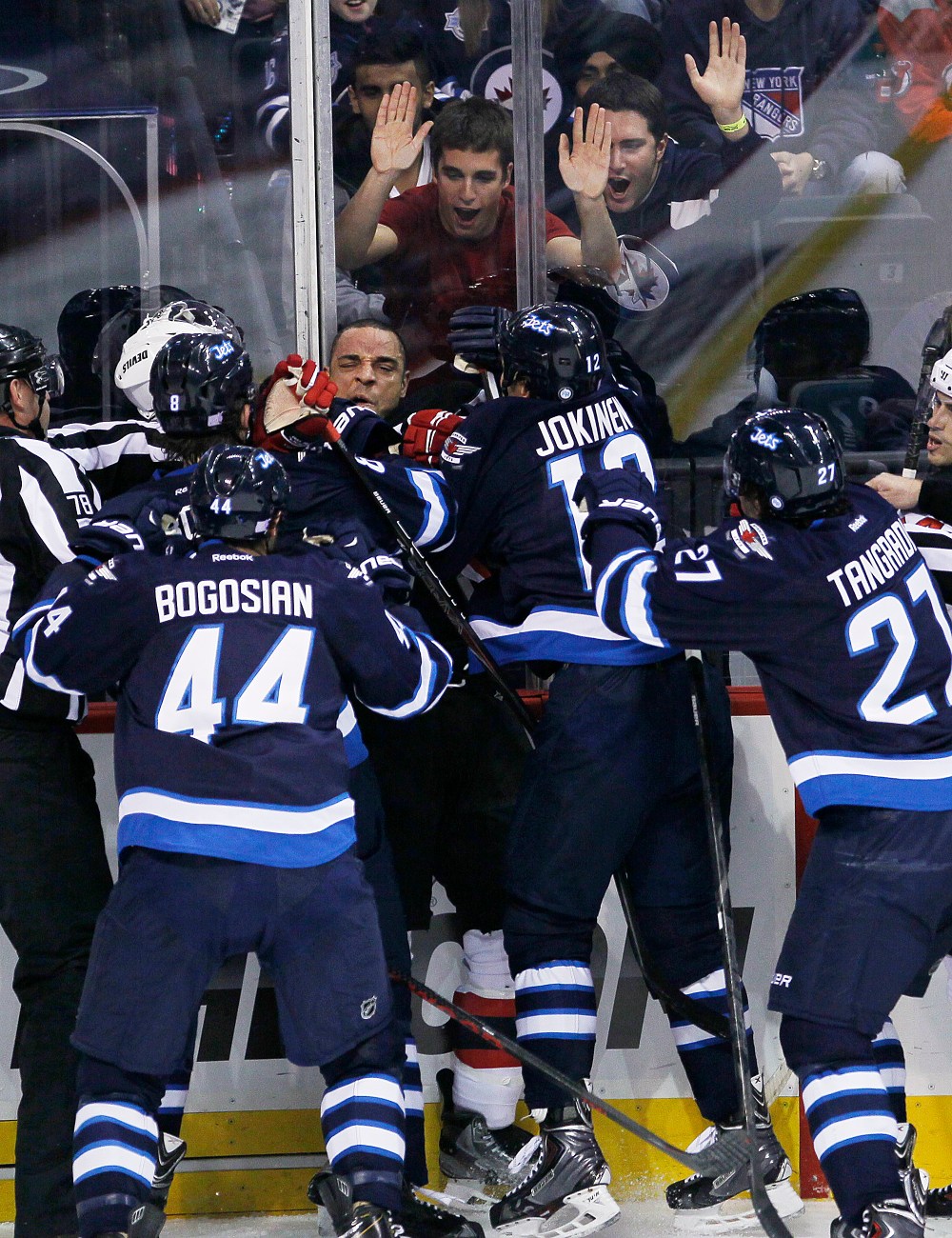 Trevor Hagan / The Canadian Press The Jets celebrate a third period goal by Andrew Ladd as Cory Schneider looks on.