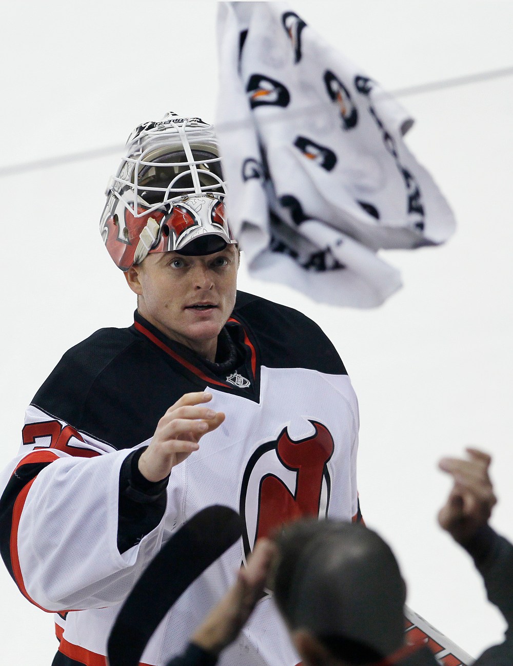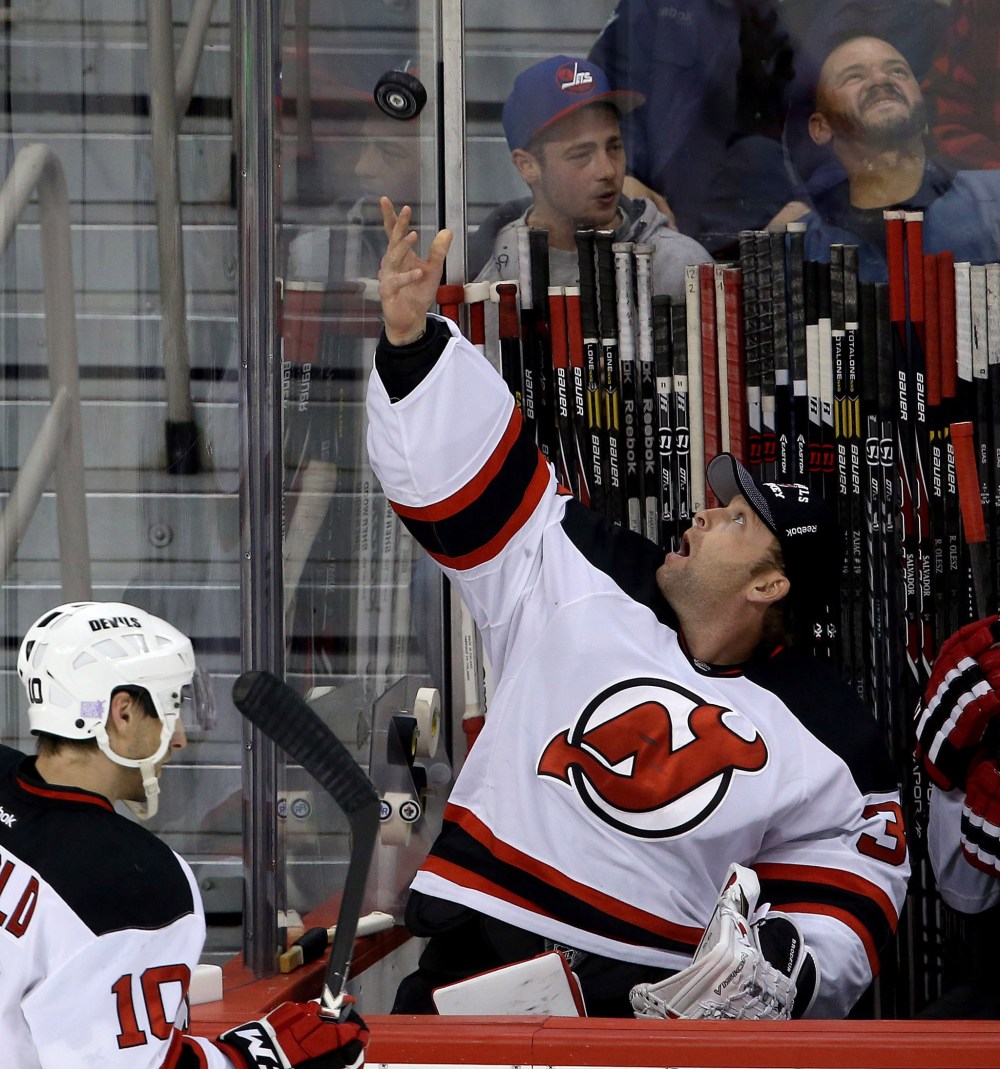Martin Brodeur tosses a puck to a fan after he caught it on the bench during the third period.