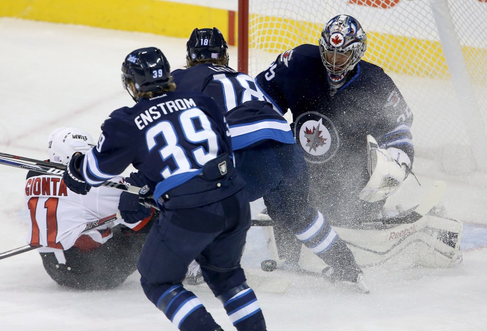 Patrik Elias goes over the top of Toby Enstrom as goaltender Al Montoya stands by during the first period.
