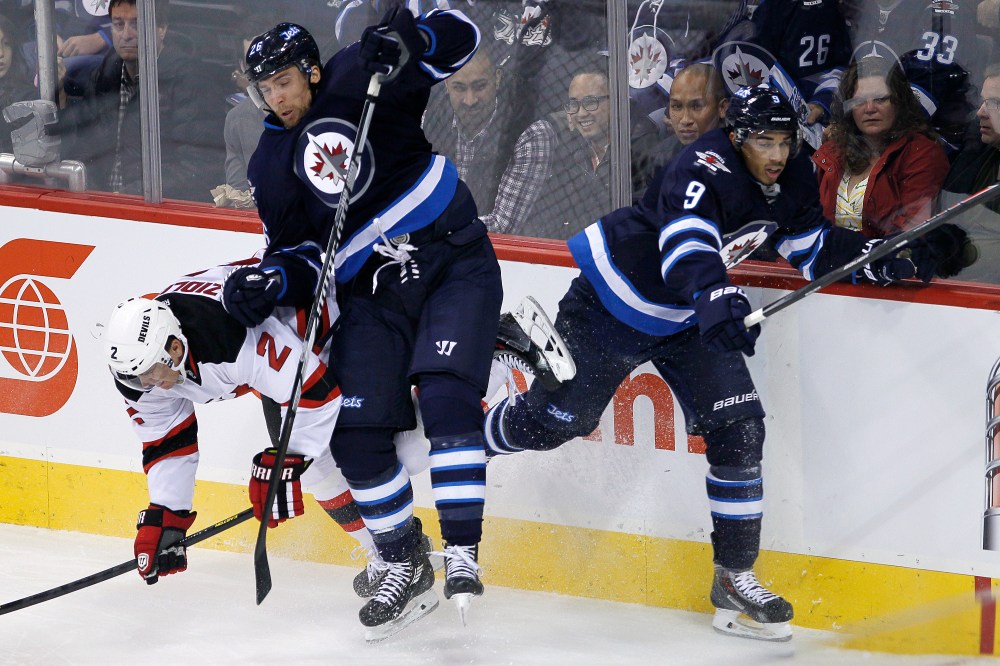 JOHN WOODS / WINNIPEG FREE PRESS Blake Wheeler and Evander Kane collide with Marek Zidlicky during the first period.