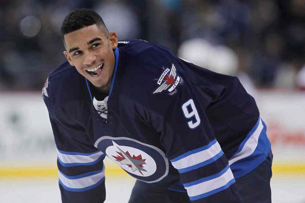 Winnipeg Jets' Evander Kane smiles at the crowd during the pre-game.