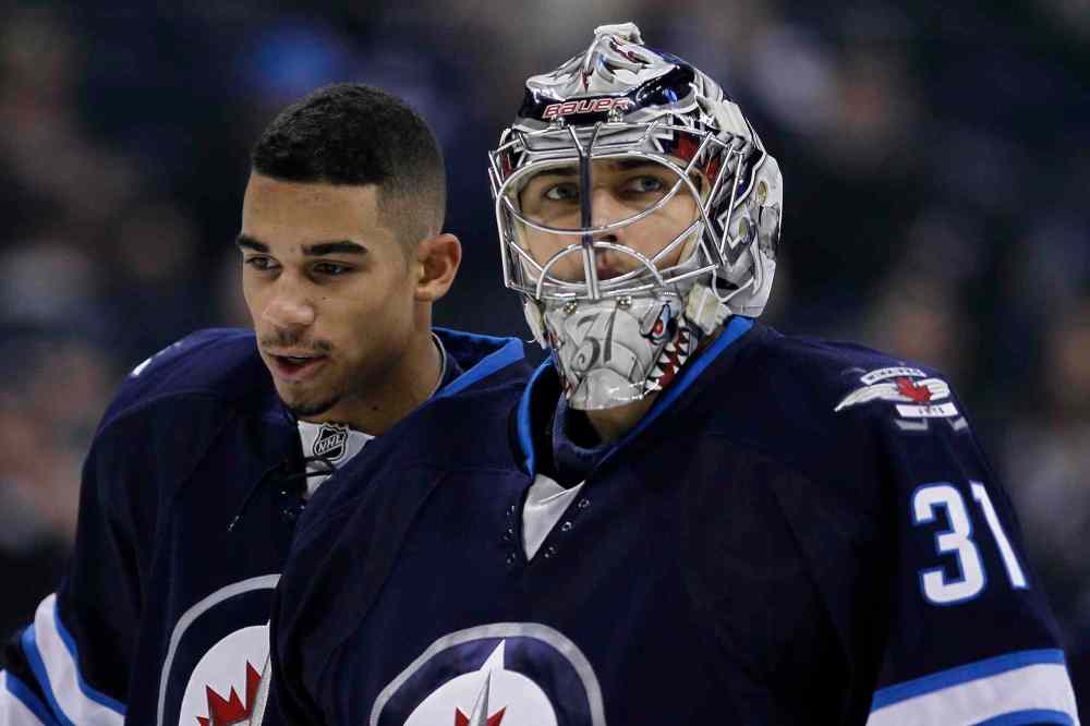 Goaltender Ondrej Pavelec and Evander Kane during the pre-game.