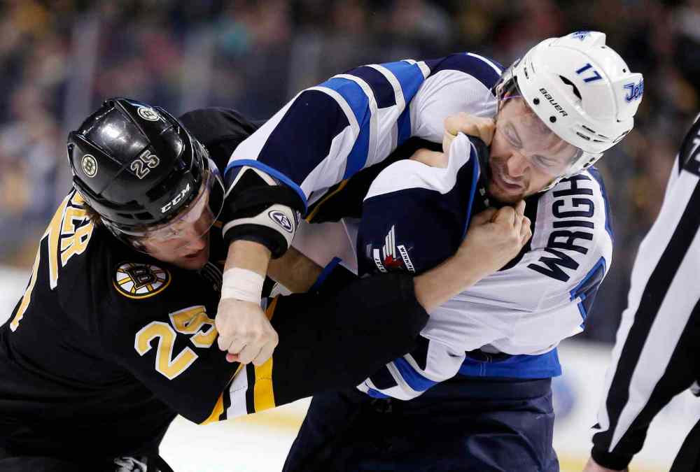 Michael Dwyer / The Associated Press Boston Bruins' Matt Fraser (25) and Winnipeg Jets' James Wright (17) fight in the first period of an NHL hockey game in Boston Saturday.