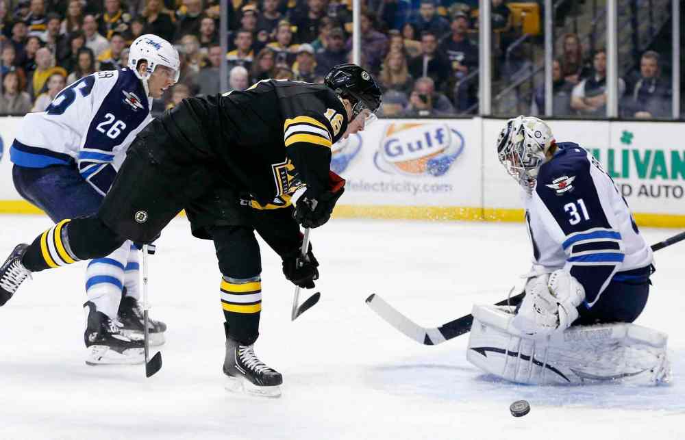 Michael Dwyer / The Associated Press Winnipeg Jets' Ondrej Pavelec (31) deflects a shot by Boston Bruins' Reilly Smith (18) in the second period Saturday.