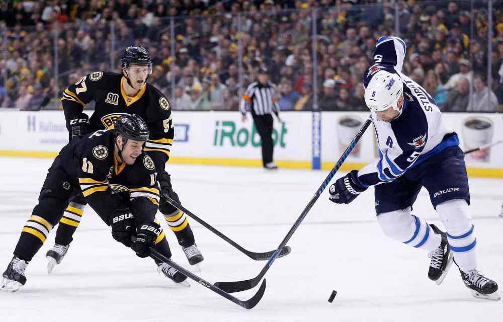 Michael Dwyer / The Associated Press Boston Bruins' Gregory Campbell (11) and Winnipeg Jets' Mark Stuart (5) battle for the puck in the second period of an NHL hockey game in Boston Saturday.