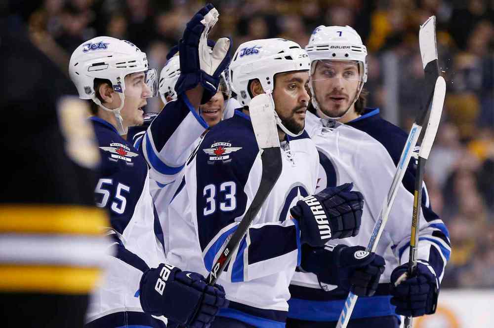 Michael Dwyer / The Associated Press Winnipeg Jets' Dustin Byfuglien (33) celebrates his goal with teammates Mark Scheifele (55) and Keaton Ellerby (7) in the first period of an NHL hockey game against the Boston Bruins in Boston Saturday.
