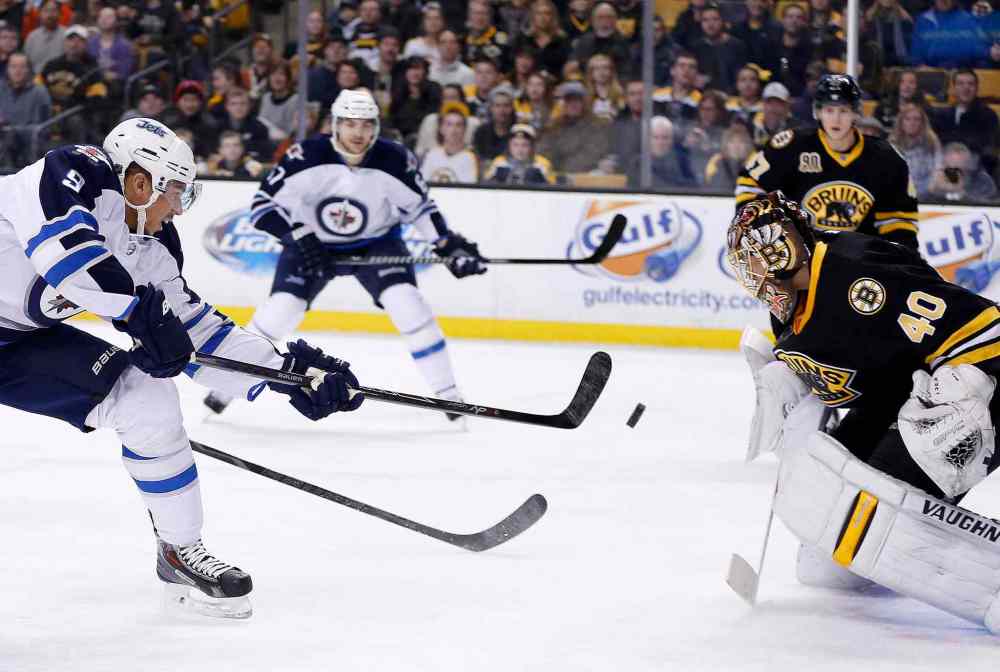 Michael Dwyer / The Associated Press Winnipeg Jets' Evander Kane (9) takes a shot on Boston Bruins' Tuukka Rask (40) in the first period Saturday.