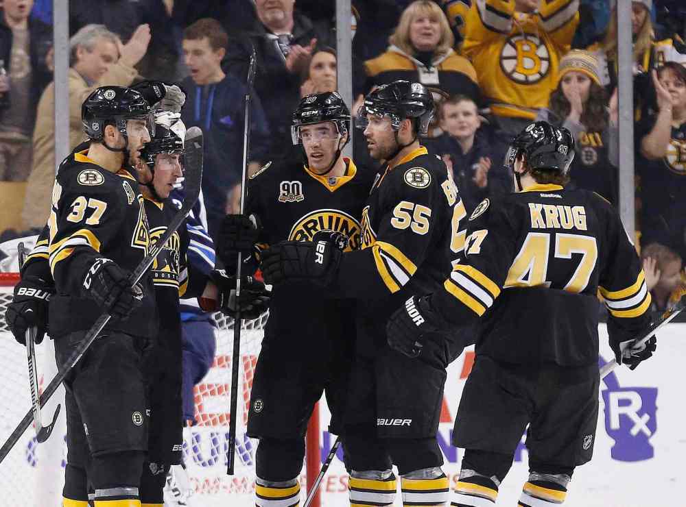 Boston Bruins' Reilly Smith, centre, celebrates his goal with teammates Patrice Bergeron (37), Brad Marchand (63), Johnny Boychuk (55) and Torey Krug (47) in the third period Saturday. The Bruins won the game 4-1.