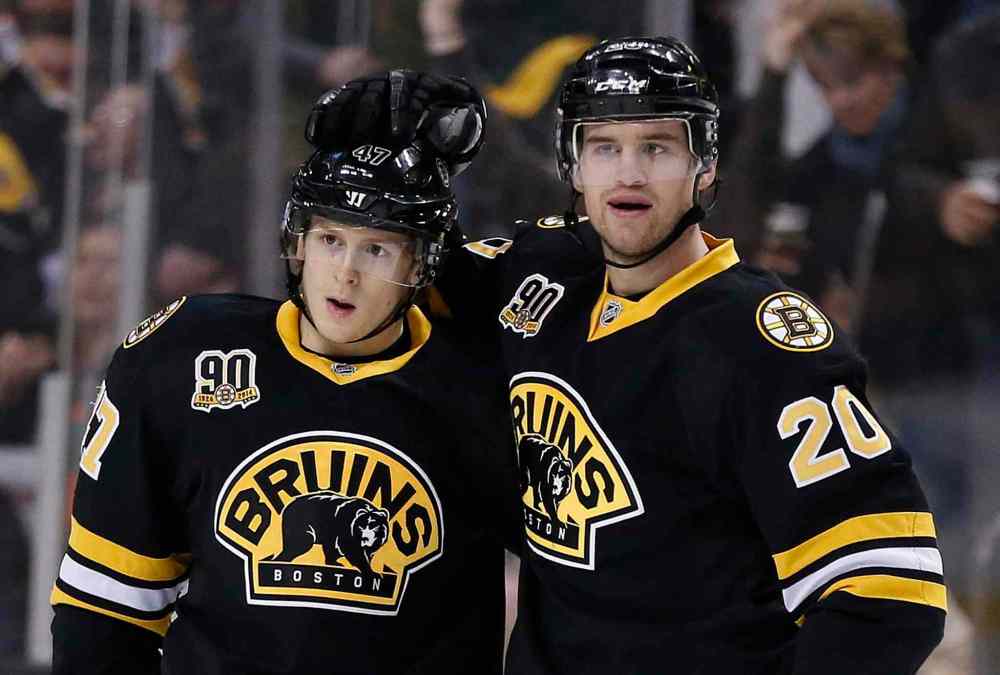 Michael Dwyer / The Associated Press Boston Bruins' Torey Krug, left, celebrates his goal with teammate Daniel Paille (20) during the second period against the Winnipeg Jets Saturday.