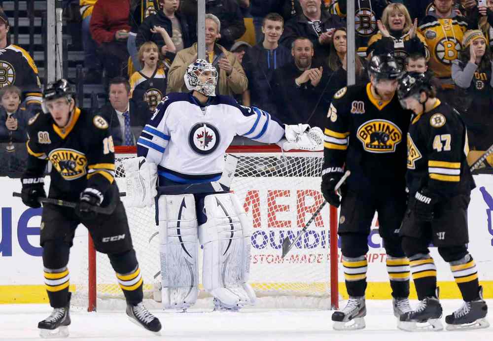 Winnipeg Jets' Ondrej Pavelec, centre, stands in the goal as Boston Bruins' Johnny Boychuk (55) and Torey Krug (47) celebrate a goal by teammate Reilly Smith, left, during third period in Boston Saturday.