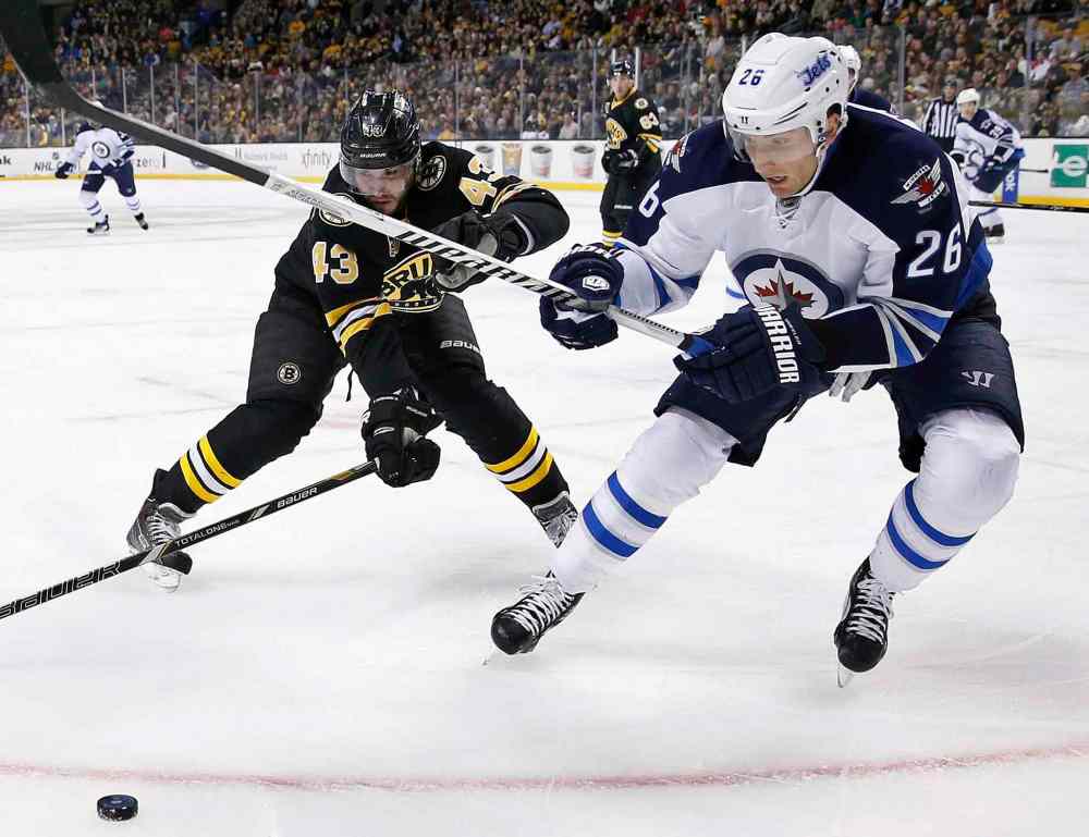 Michael Dwyer / The Associated Press Boston Bruins' Matt Bartkowski (43) and Winnipeg Jets' Blake Wheeler (26) battle for the puck in the first period of NHL action in Boston Saturday.