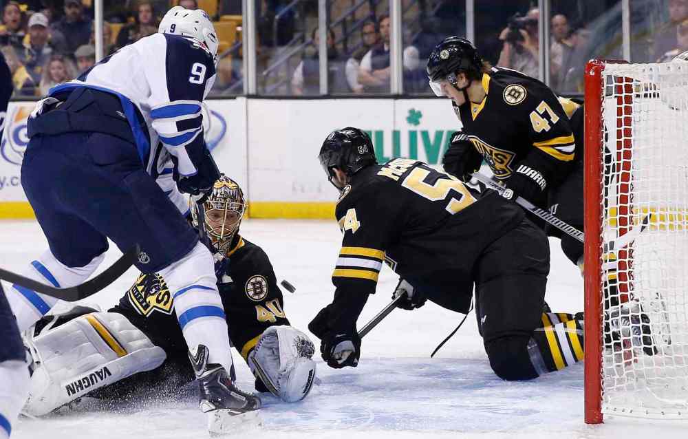 Michael Dwyer / The Associated Press Winnipeg Jets' Evander Kane (9) looks for the rebound as the puck deflects off of Boston Bruins' Tuukka Rask (40) while the Bruins' Adam McQuaid (54) and Torey Krug (47) defend in the first period.
