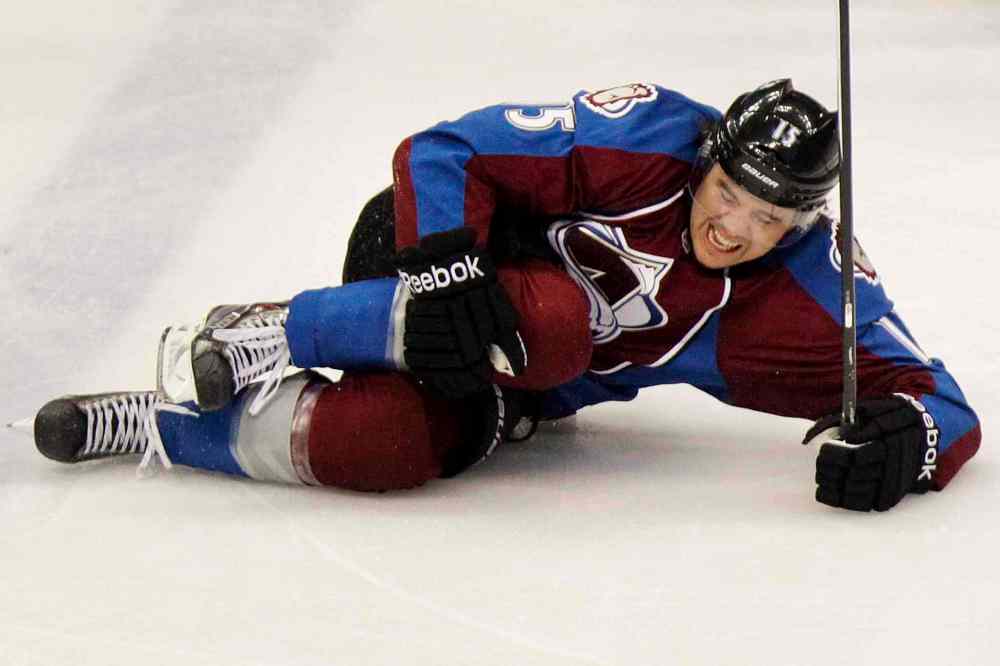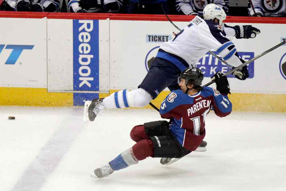 BARRY GUTIERREZ / THE ASSOCIATED PRESS Colorado Avalanche's P.A. Parenteau grabs his leg after being hit by Jets defenceman Mark Stuart during the first period. Parenteau was unable to continue playing following the hit.