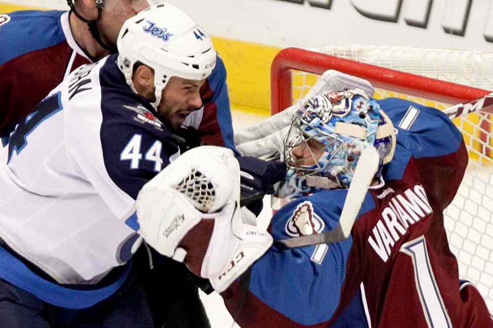 Winnipeg Jets defenceman  Zach Bogosian gets tangled up with Colorado Avalanche goalie Semyon Varlamov during the first period.