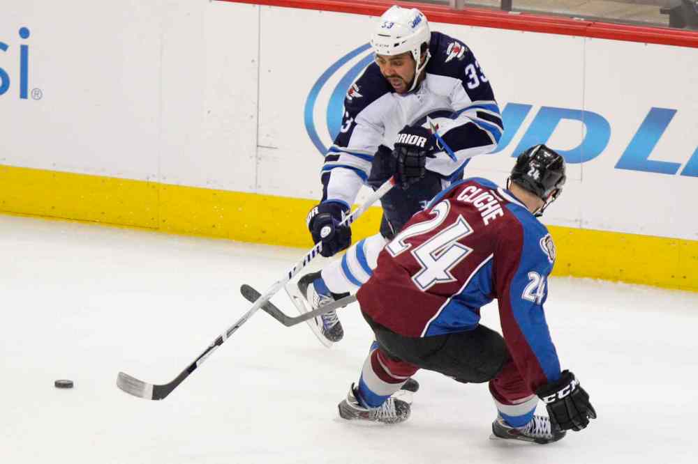 Winnipeg Jets forward Dustin Byfuglien passes the puck behind Marc-Andre Cliche of the Colorado Avalanche.