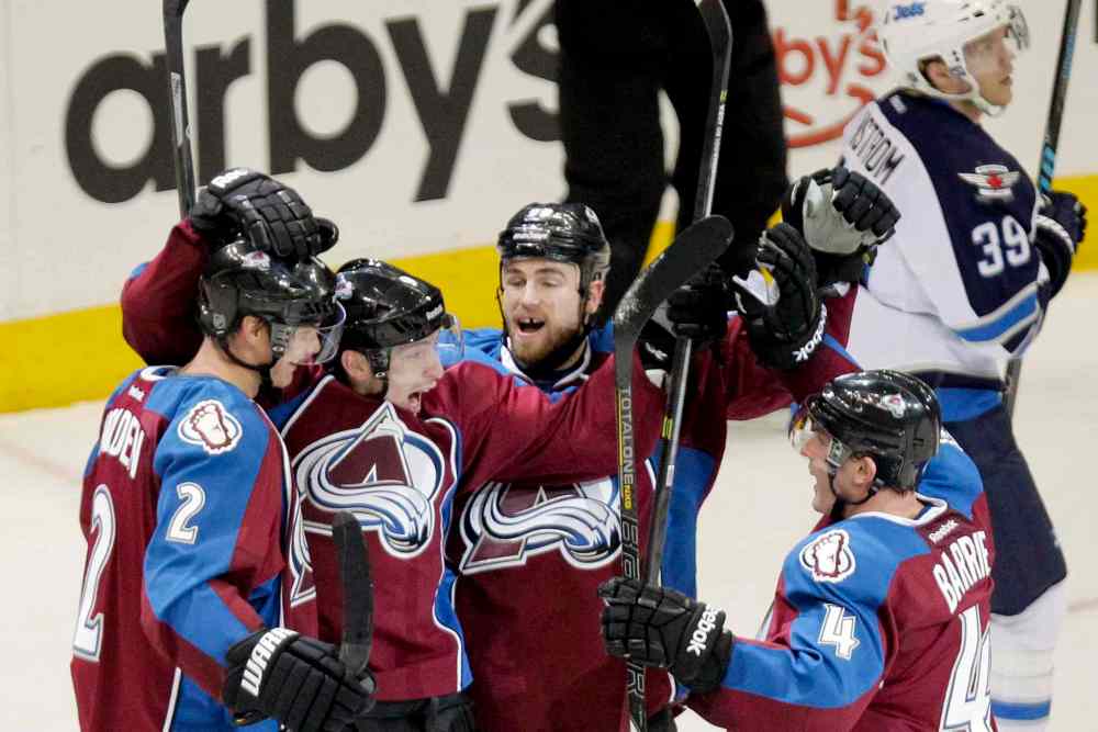 BARRY GUTIERREZ / THE ASSOCIATED PRESS Colorado Avalanche forward Matt Duchene, second from left, celebrates after scoring the game-winning goal past Winnipeg Jets goalie Al Montoya during overtime of an NHL game at the Pepsi Center in Denver, Colo., Monday. The Avalanche won 3-2 to hand the Jets their fourth straight defeat.