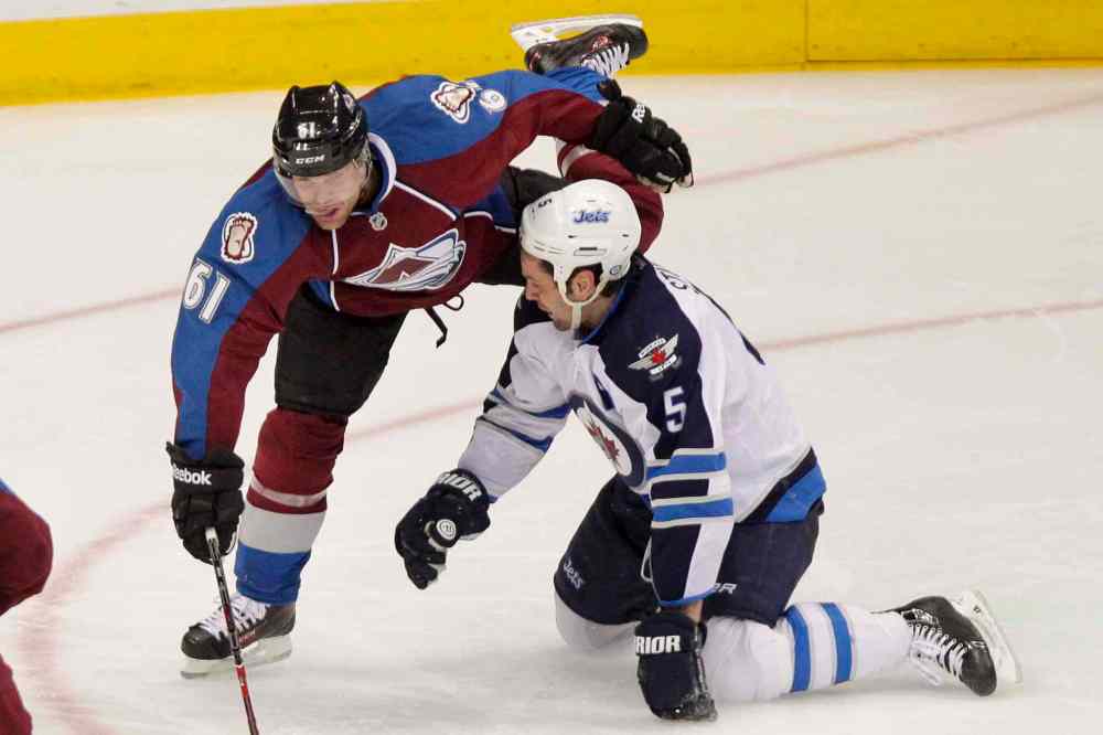 BARRY GUTIERREZ / THE ASSOCIATED PRESS Winnipeg Jets defenceman Mark Stuart lays out the Colorado Avalanche's P.A. Parenteau during the first period.