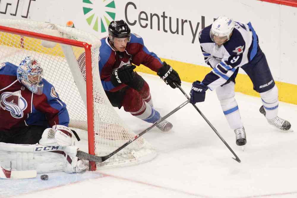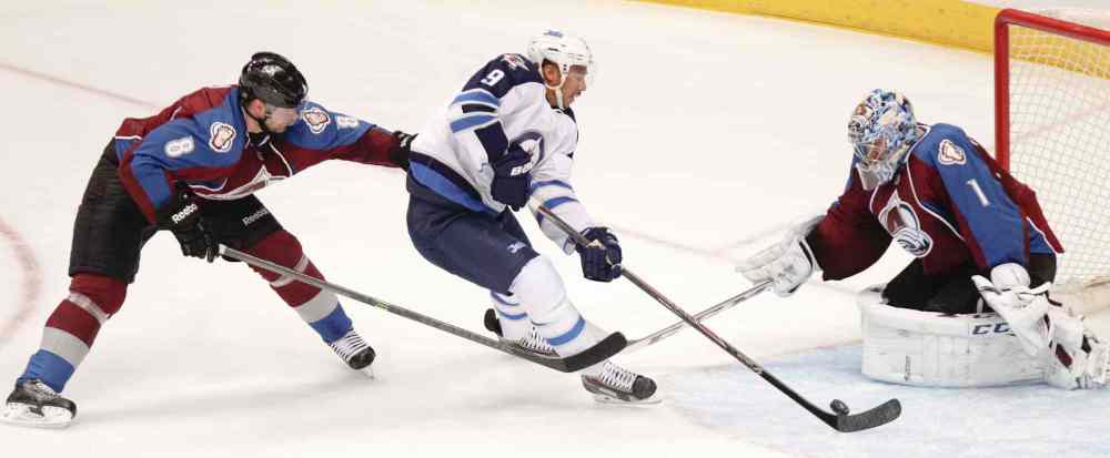 BARRY GUTIERREZ / THE ASSOCIATED PRESS Winnipeg Jets forward Evander Kane gets by Colorado Avalanche's Jan Hejda for a shot on goal, which was saved Semyon Varlamov.