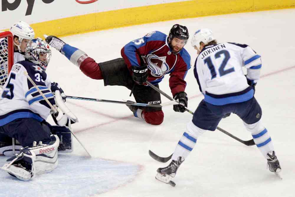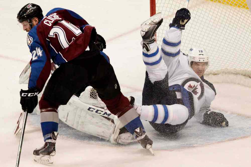 BARRY GUTIERREZ / THE ASSOCIATED PRESS Winnipeg Jets centre Jim Slater is called for interfering with the goalie while Colorado Avalanche right-winger Marc-Andre Cliche clears the puck during the first period.