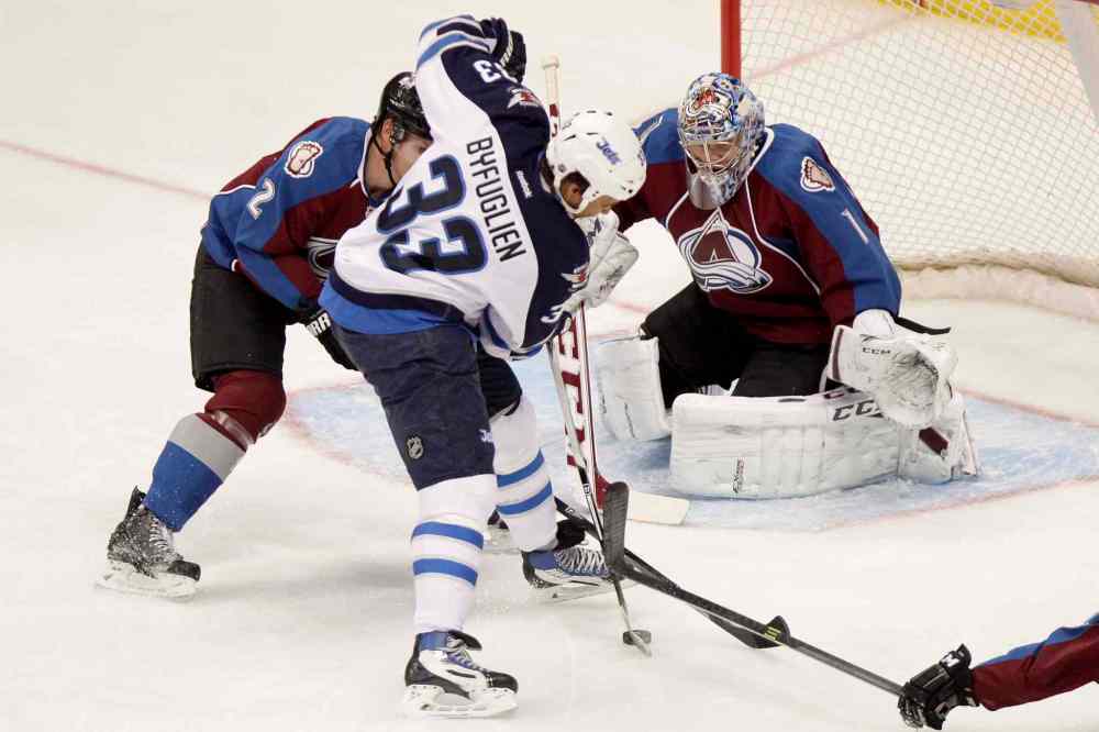 BARRY GUTIERREZ / THE ASSOCIATED PRESS Winnipeg Jets forward Dustin Byfuglien takes a shot on Colorado Avalanche goalie Semyon Varlamov while fighting off a check during the first period. Byfuglien scored both Jets goals.