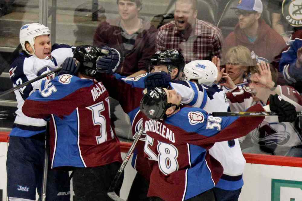 BARRY GUTIERREZ / THE ASSOCIATED PRESS Winnipeg Jets forward Olli Jokinen, left, throws a punch at Colorado Avalanche's Cody McLeod as other players mix it up during the first period.