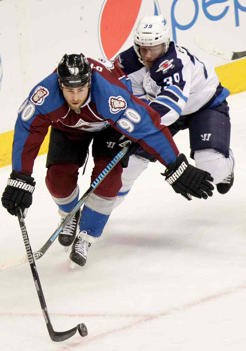 BARRY GUTIERREZ / THE ASSOCIATED PRESS Colorado Avalanche centre Ryan O'Reilly and Winnipeg Jets defenceman Tobias Enstrom compete for the puck during the first period.