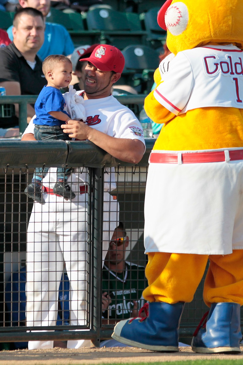 Winnipeg Goldeyes' mascot plays with Goldeyes catcher Luis Allen and baby at the All-Stars Skills Competition.