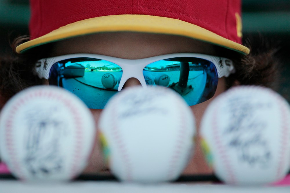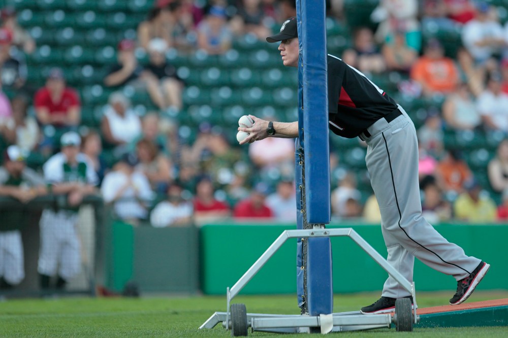 Kevin Hooper, manager of the South Allstar team, takes a break from pitching during Monday's skills competition.