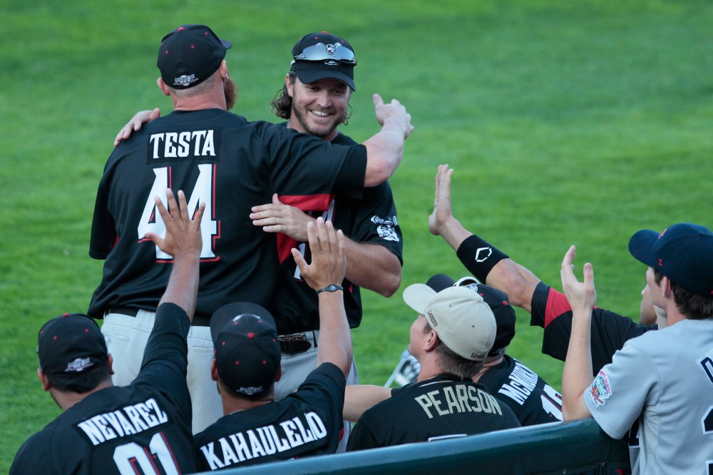 John Woods / WInnipeg Free Press Carlo Testa of the Wichita Wingnuts is congratulated by his team for winning the title of Fastest Baserunner at the All-Star Skills Competition in Winnipeg Monday.