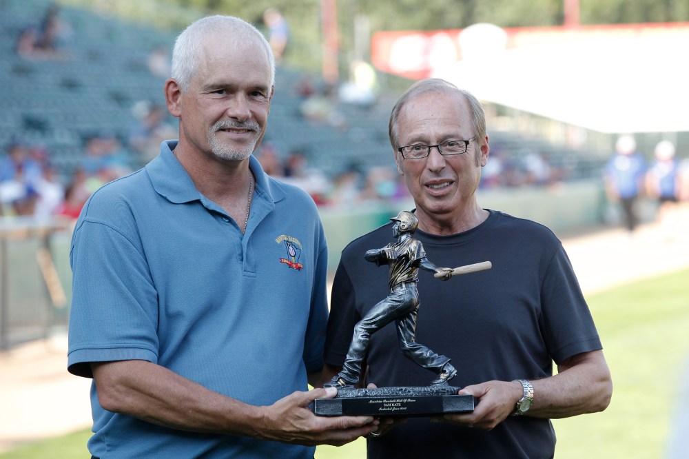 Goldeyes' owner Sam Katz is welcomed into the Manitoba Baseball Hall of Fame at the All-Stars Skills Competition Monday.