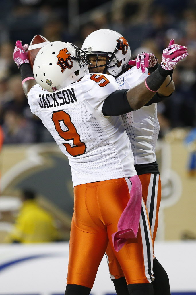 John Woods / The Canadian Press B.C. Lions' Ernest Jackson (9) and Keola Antolin (1) celebrate Antolin's touchdown against the Winnipeg Blue Bombers.