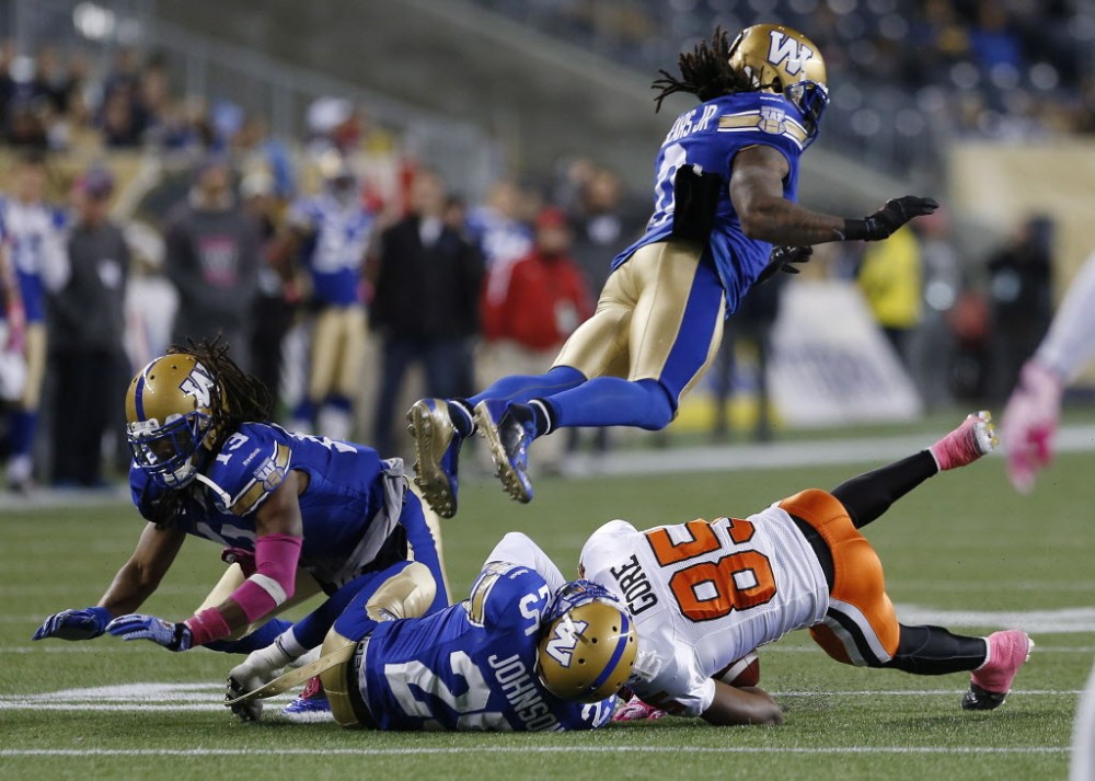 John Woods / The Canadian Press Winnipeg Blue Bombers' Bruce Johnson (25) tackles BC Lions' Shawn Gore (85) as Bombers' Johnny Sears (0) goes over the top.