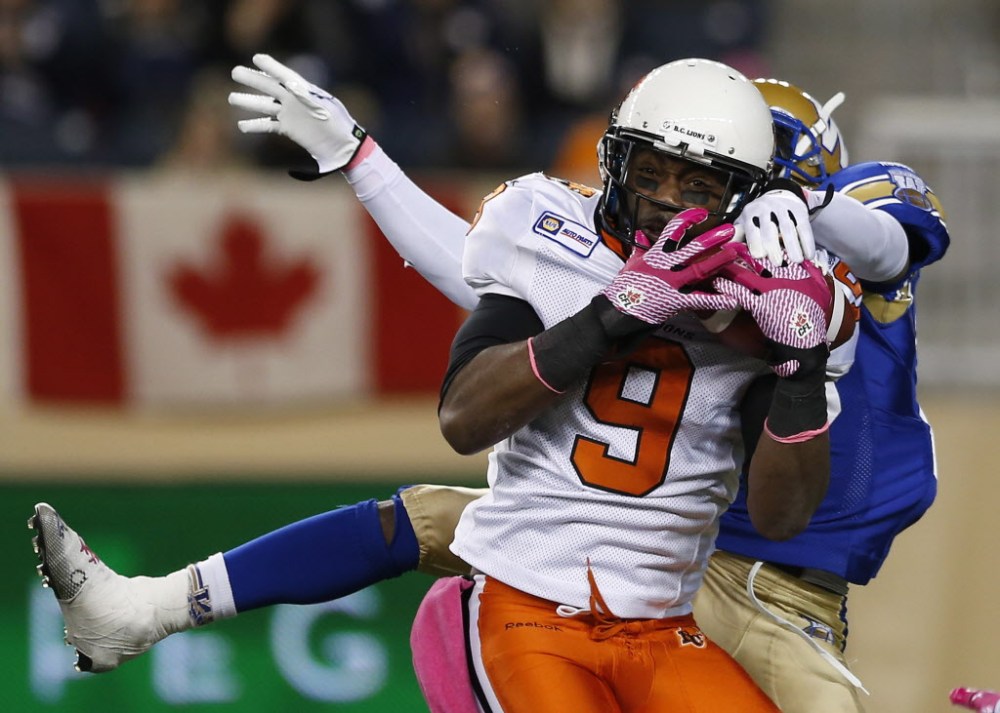 John Woods / The Canadian Press Winnipeg Blue Bombers' Bruce Johnson (25) can't stop B.C. Lions' Ernest Jackson (9) from hauling in this pass.