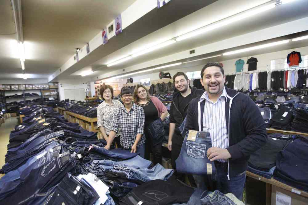 Mohamed El tassi (right, front) one of the owners of Sargent Blue Jeans, poses with some of the longtime staff at the neighbourhood jean store between long tables of high-end designer jeans. Staffers:  Kathy Malandrakis (from left), Sandra Harold, Maria Lima and Mohamed Tassi.